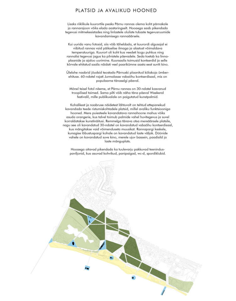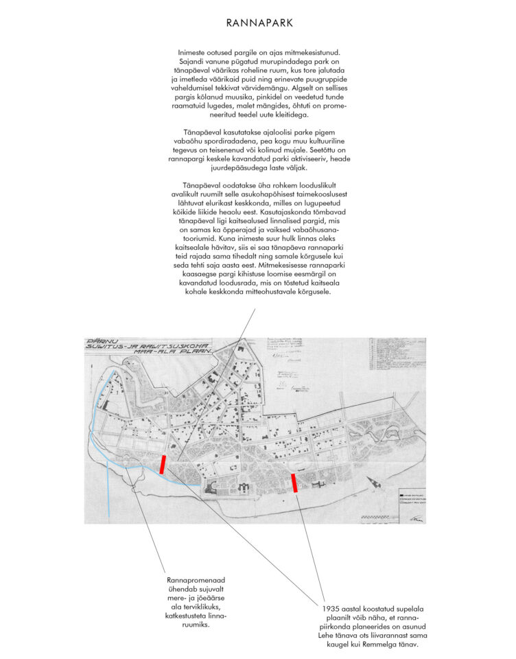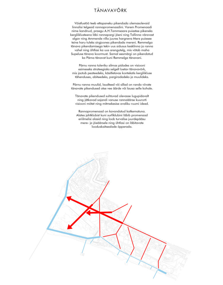 Pärnu ranna visiooni loob selgelt loetava tänavavõrgu, mis jaotub peateedeks, käsitletavas kontekstis kergliikluse tähenduses, abiteedeks, pargiradadeks ja muulideks. Pärnu ranna muulid, laudteed või sillad on randa viivate tänavate pikendused otse vee äärde või lausa selle kohale. Mitmekesisesse rannaparki kaasaegse pargi kihistuse loomise eesmärgil on kavandatud loodusrada, mis on tõstetud kaitseala kohale looduskeskkonnale ohutule kõrgusele.