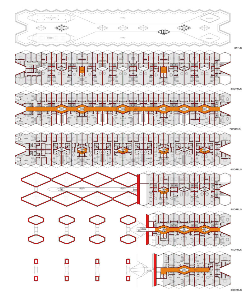 Promenade facing Tallinn Bay is flanked with modernist park with museums, Flower Pavilion and the singing festival grounds. These are all prominent structures with state level importance. We proposed an apartment building that intentionally follows the modernist rules. The apartment block is lifted into the air, it has a garden roof and the three-storey apartment block entrances are designed in the line of the Unité d’Habitation.