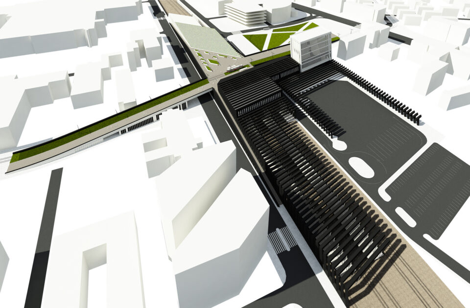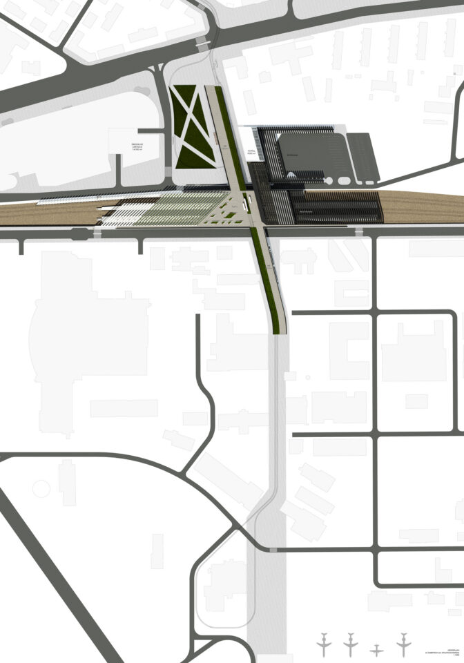 Võistlustöö teeb ettepaneku siduda Keevise ja Majaka tänavad üle rajatava raudteejaama linnaruumis selgelt loetavaks peatänavaks, mis viib lennujaamast kesklinna. Võistlustöö ettepanek tõsta trammi- ja kergliiklustee 100 meetri pikkusest tunnelist tulevase raudteejaama esisele platsile avab saabujale linna, vaadetega üle hoonete, esimese hetkega. Õhtupäikesesse avanev terminali esine plats on linna värav.