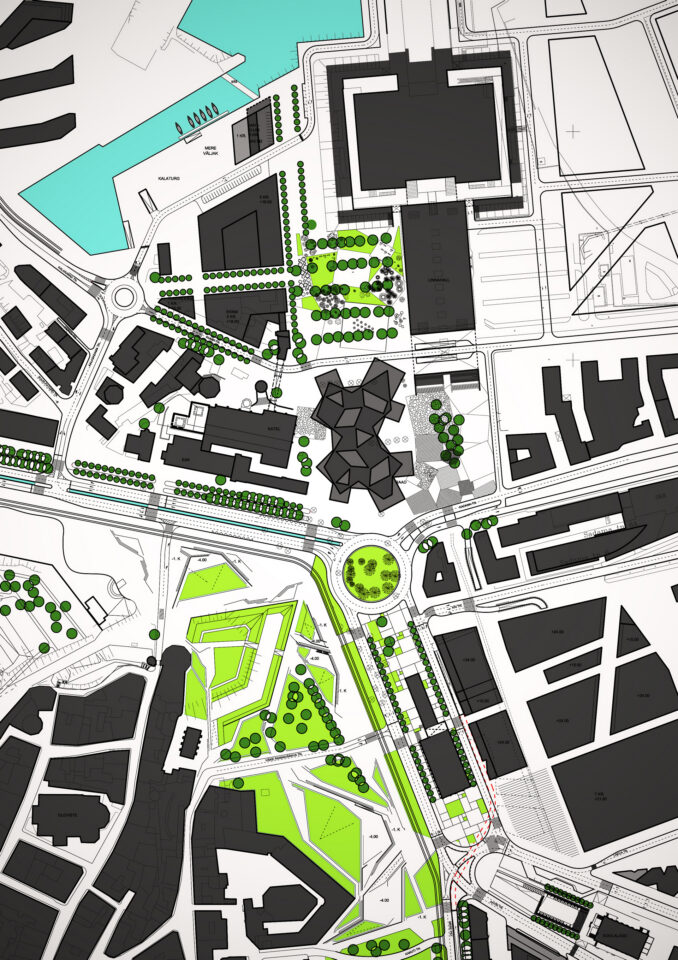The objectives of the plans are to extend the Old Town pedestrian area to the sea, where the Town Hall, Kultuurikatel and various other public buildings will be located in the future. The plans reorganise the entire traffic scheme between the sea and the Old Town and provide guidelines also for the future development of the neighbouring regions.
