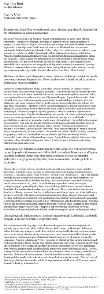 Linlased ei ela, tööta ega puhka tänavatel vaid nende ääres. Tänased tänavad on iseloomutud ühetaolised kulglad. Need koridorid tuleb tasapisi ümber ehitada tänavateks – kohtadeks, mis oleksid argisteks koriluspaikadeks. Sel teel pole üht võtit. Uurimimistöö eesmärgiks on luua tänapäevase tänavakorilase sõnavara.